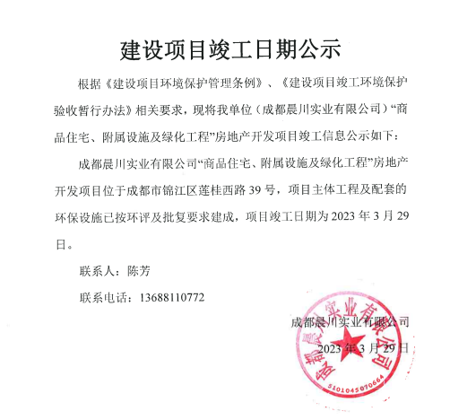 成都晨川实业有限公司“商品住宅、附属设施及绿化工程”房地产开发项目位于成都市锦江区莲桂西路39号,项目主体工程及配套的环保设施已按环评及批复要求建成,项目竣工日期为2023年3月29日。